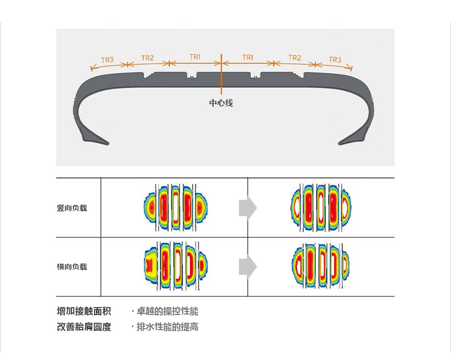 从赛车断面技术中实现优化的三重胎面半径系统,可以确保轮胎在高速行驶条件下也能发挥良好性能。