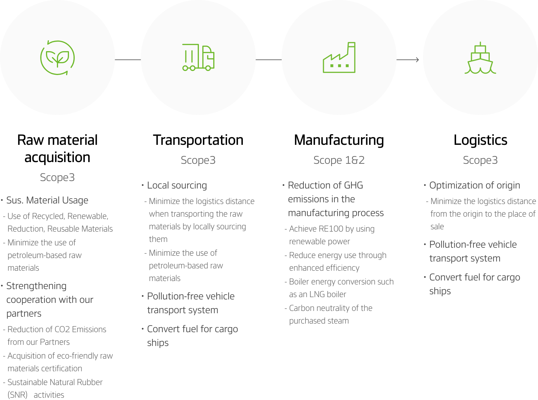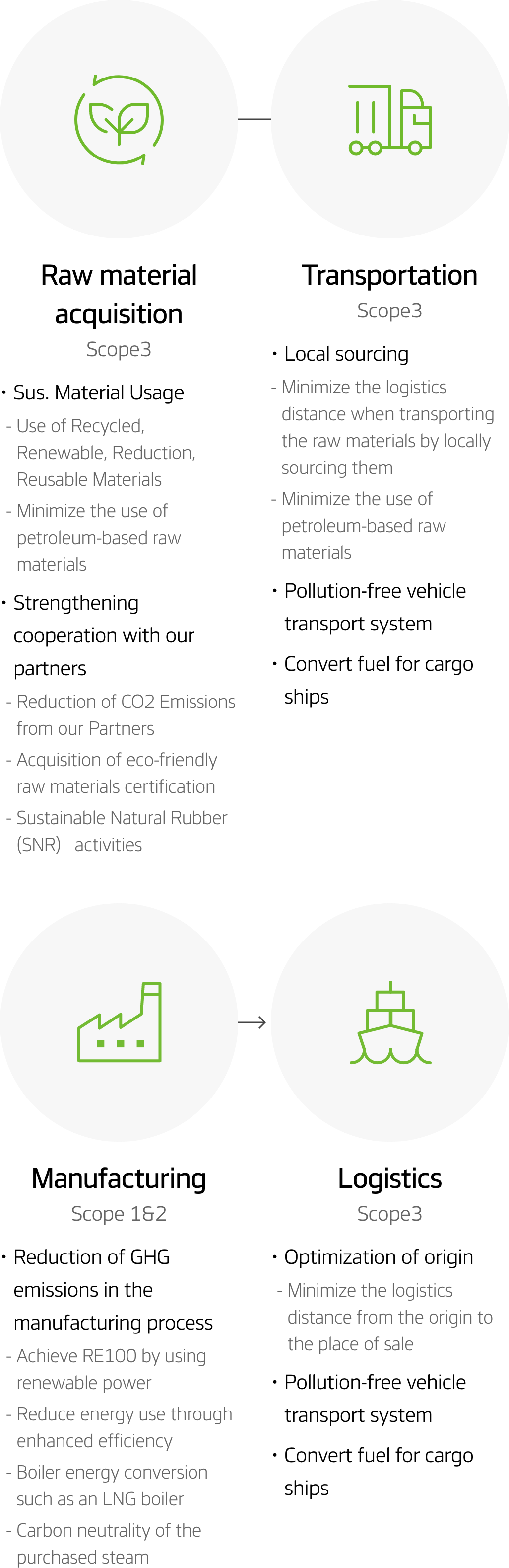 We will establish a specific carbon reduction plan and meticulously implement it in stages to achieve our reduction goals, based on four major initiatives: establishing a low-carbon management system, improving the process energy use efficiency, expanding the use of renewable energy, and introducing renewable energy innovative reduction technologies. In the short term, the aim is to minimize energy use across the tire manufacturing process while laying the groundwork for a long-term energy transition on a continuous review basis in order to discover eco-friendly alternative energy. We will establish a carbon-neutral roadmap suitable for the 2050 value chain which will allow us to develop and implement a number of detailed implementation strategies focused on each area.