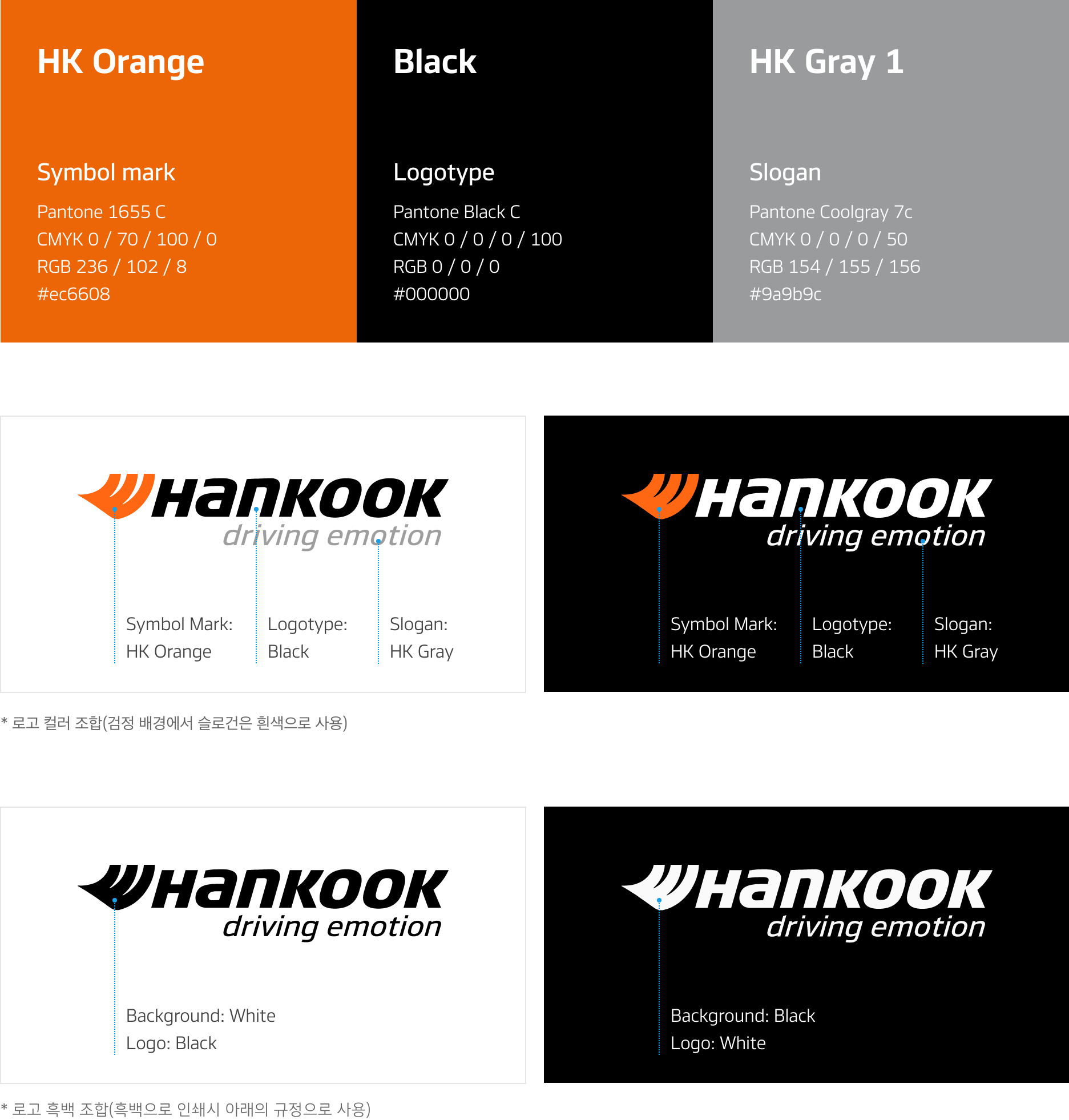 Hankook Tire & Technology의 컬러는 Orange와 Black을 기본으로 사용하며, 인쇄 시에는 별색 인쇄를 기본으로 하나 별색 사용이 불가능할 경우 Process Color의 CMYK 색상으로 대신하여 사용할 수 있습니다.