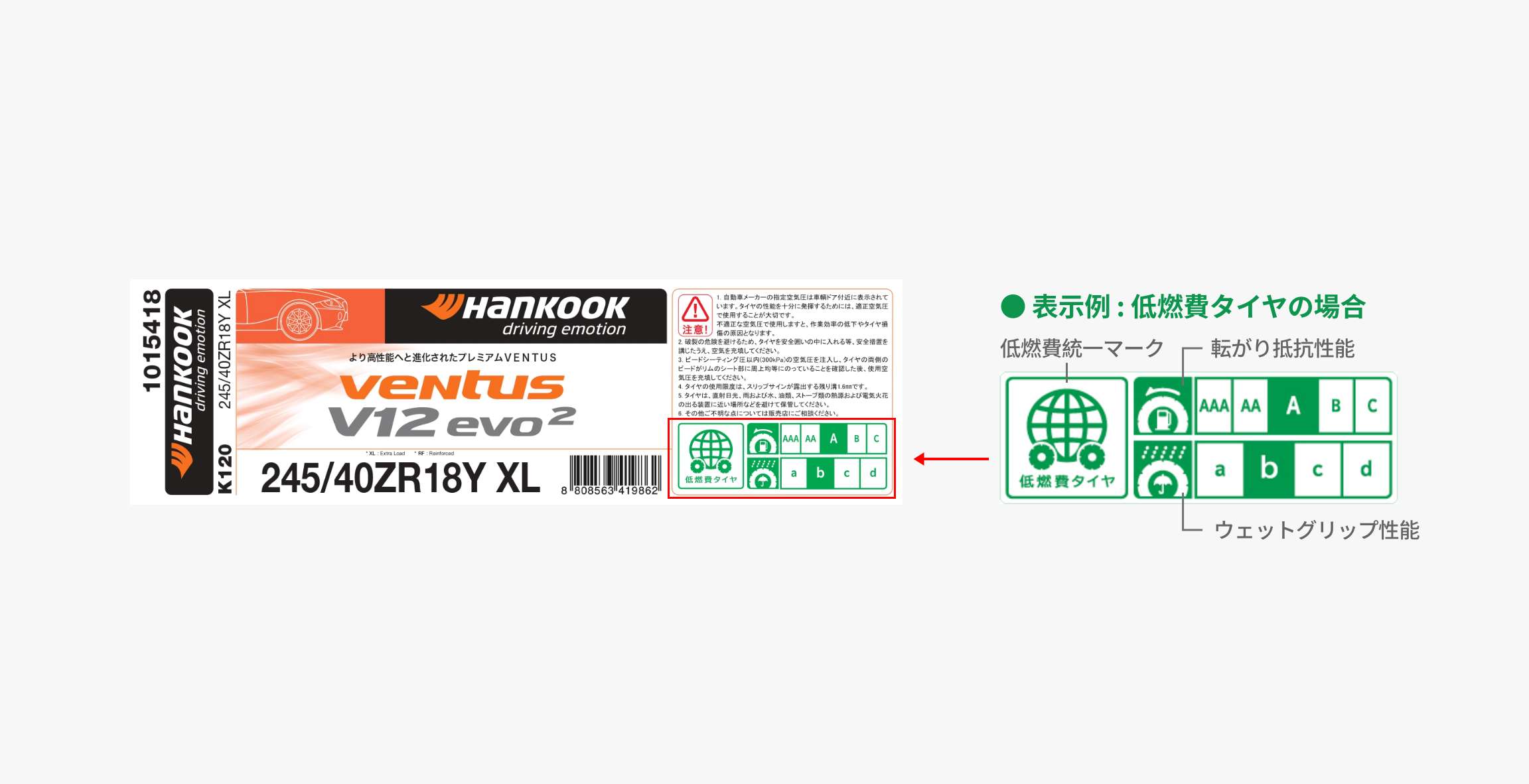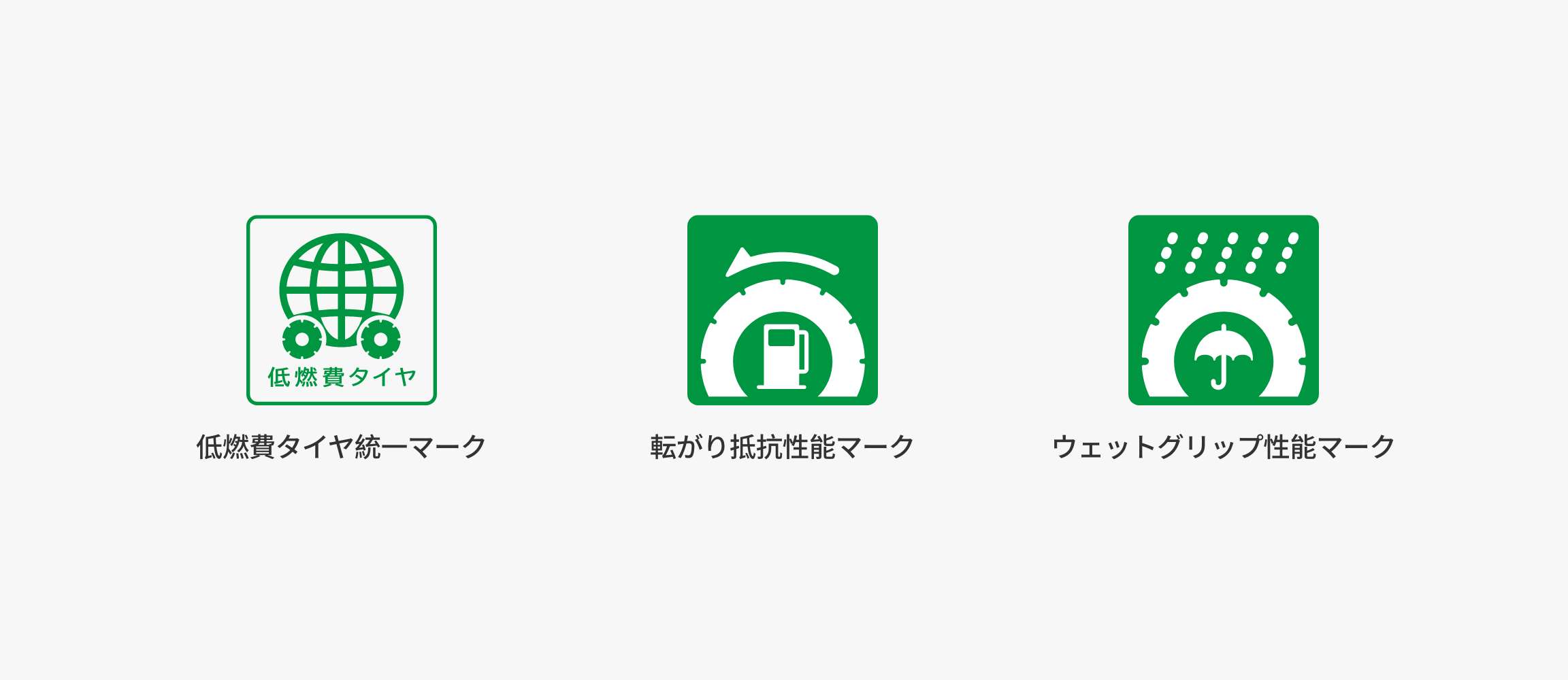 転がり抵抗性能の等級が AAA・AA・Aで、ウェットグリップ性能の等級が a・b・c・dに、該当するタイヤを「低燃費タイヤ」と定義し、「低燃費タイヤ統一マーク」が表記されています。