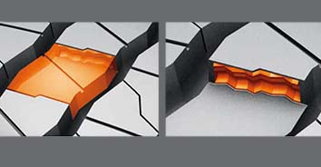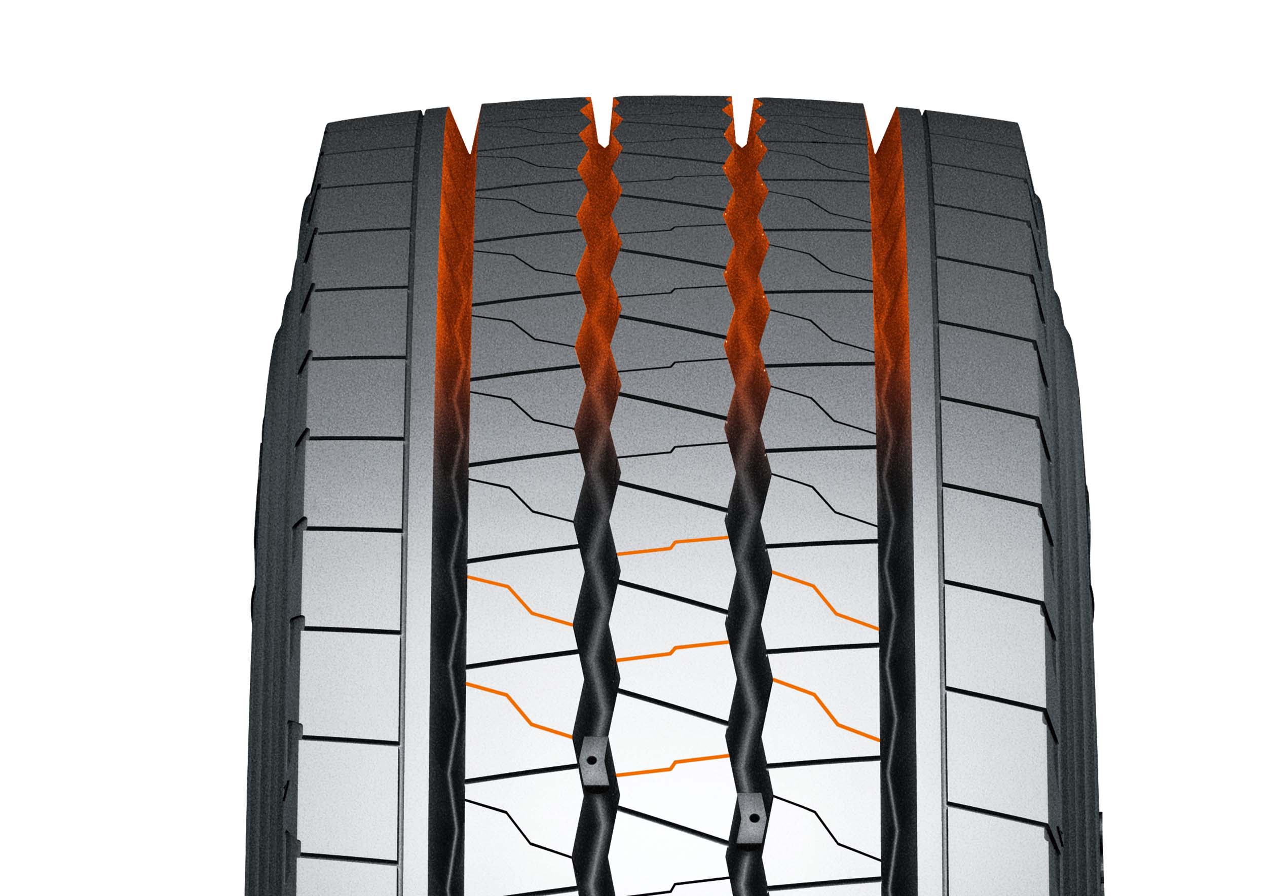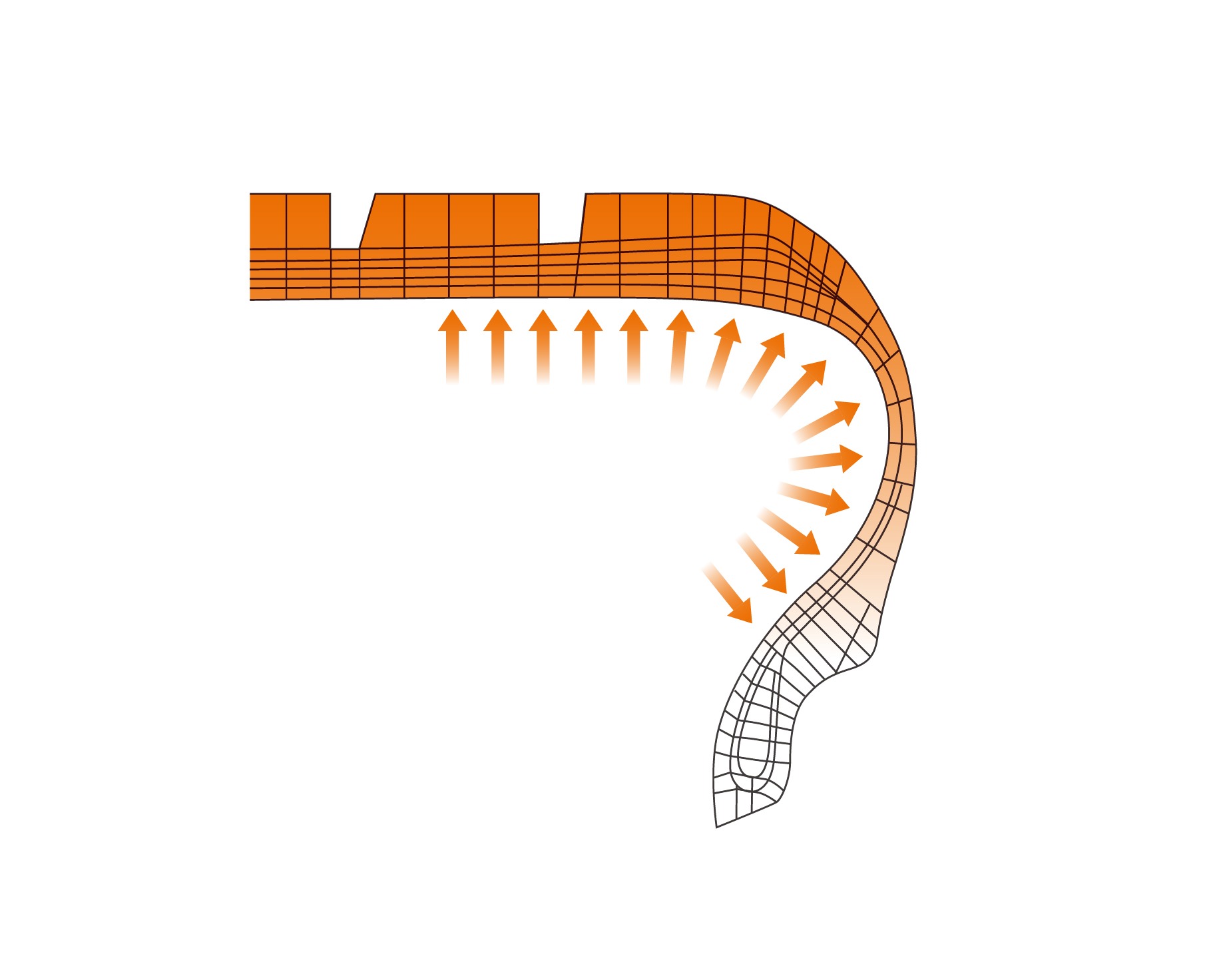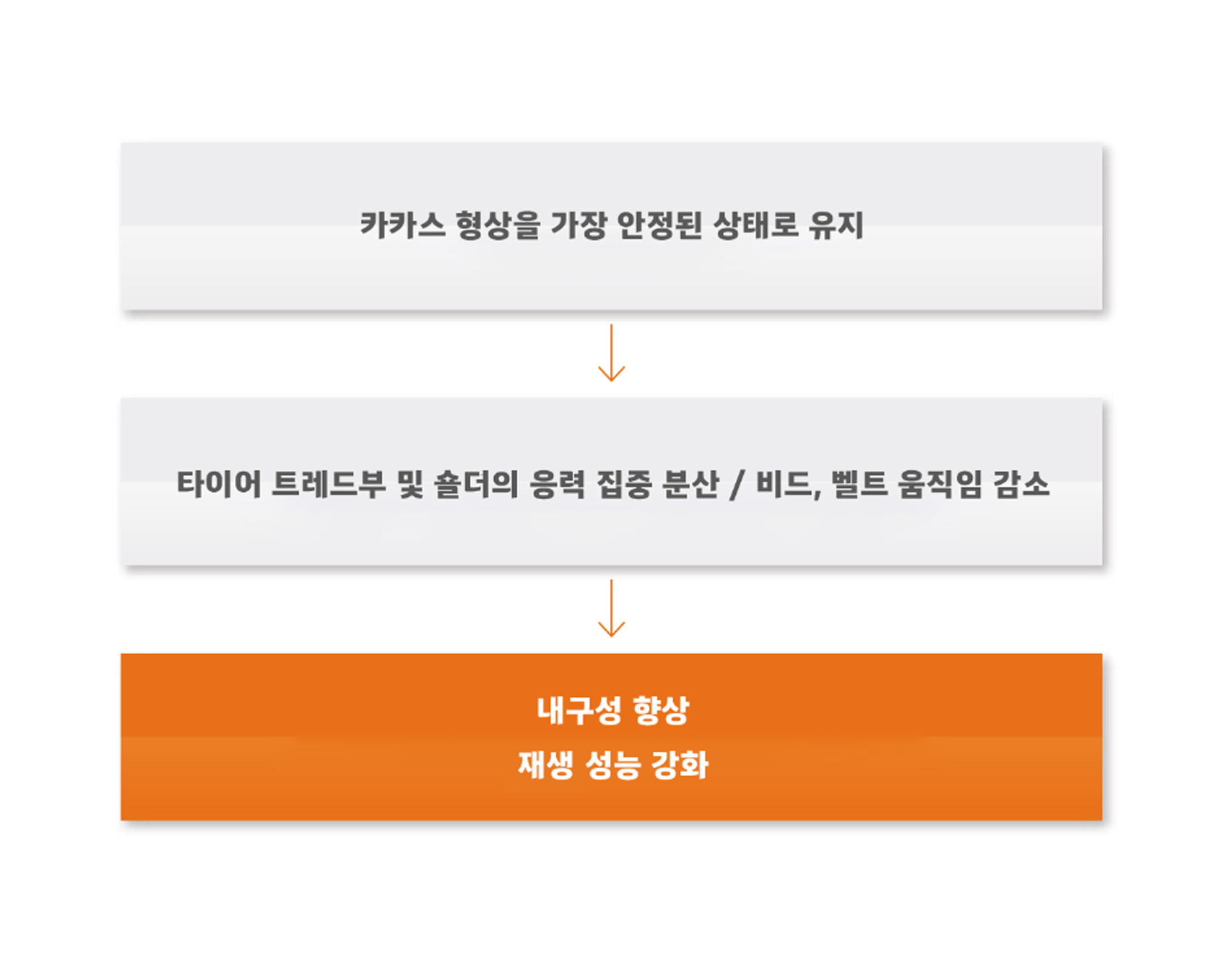 SCCT 기술로 프로파일 변형을 안정되게 유지합니다. 카카스 프로파일이 안정적이지 않으면 벨트 엣지나 턴업된(turned up) 카카스 엣지 등 특정 지점에 카카스 응력이 집중됩니다. SCCT 기술은 이러한 응력을 분산하여 내구성을 향상합니다.한국타이어는 SCCT를 활용하여 최적의 접촉면 강성을 유지함으로써 성능, 안전성, 코너링, 제동력, 내구성을 강화하였습니다.