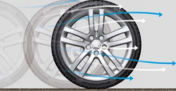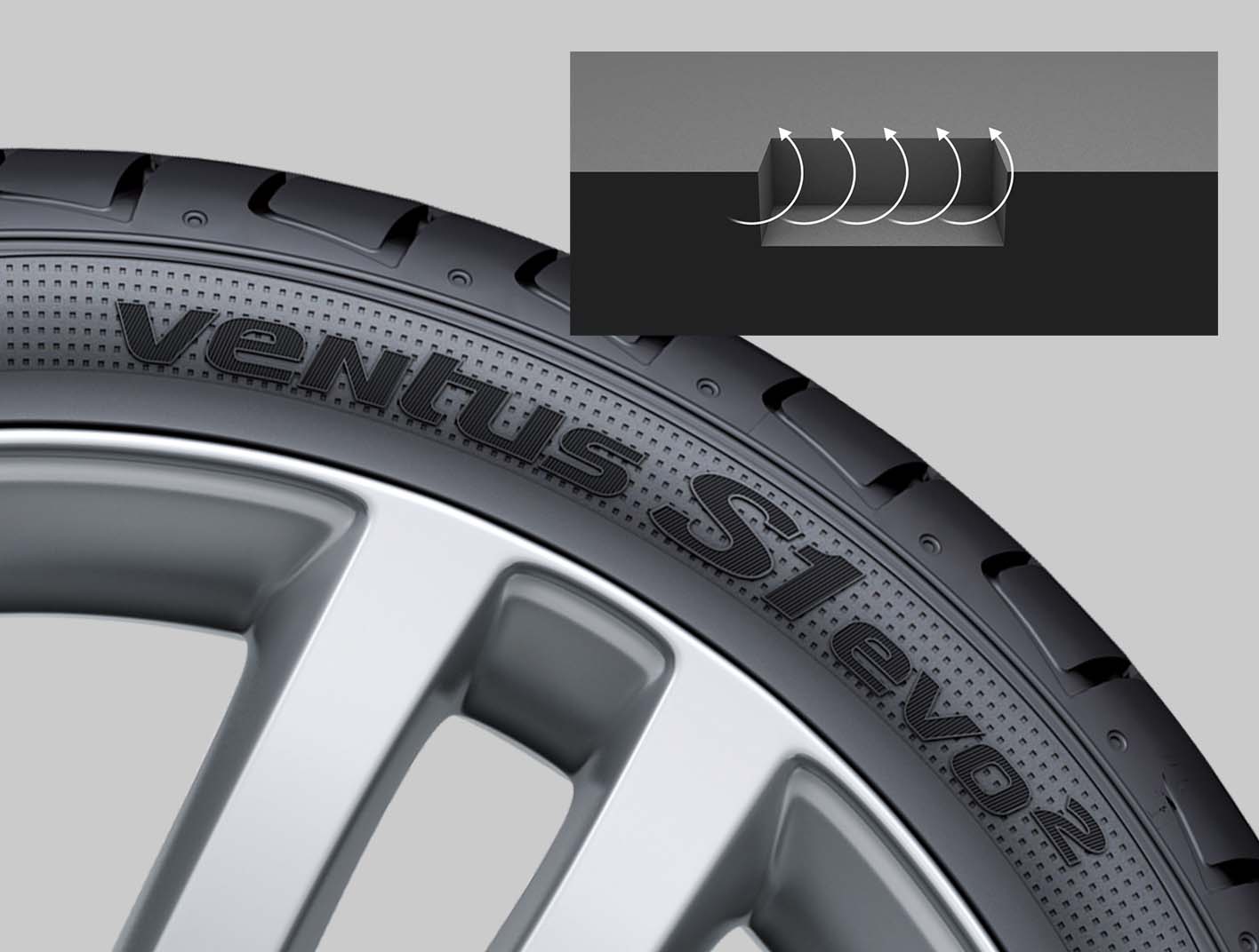 Dynamic graphic design that matches tread pattern brings out sportiness on the sidewall. Aero dynamic sidewall design through rectangular dimples minimize noise and vibration levels by reducing air turbulence whilst driving.