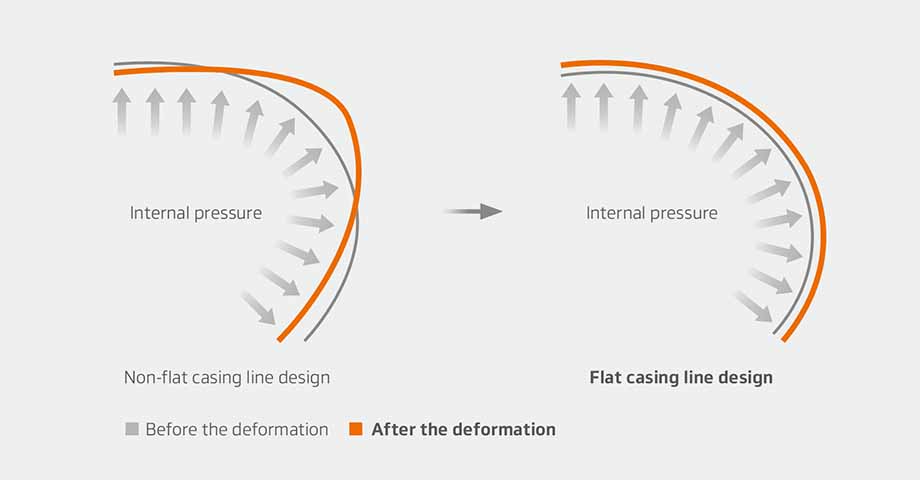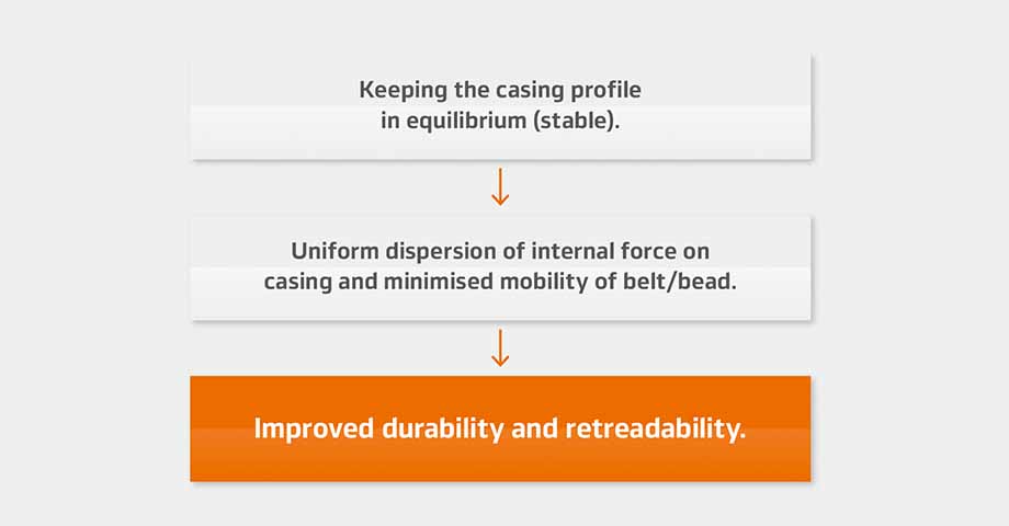 SCCT Technology is designed to reduce profile deformation. If the carcass profile is not kept constant, the internal force on the carcass will be concentrated on a specific point (belt edge or carcass turn up edge). In contrast, SCCT technology controls the dispersion of internal force for better durability.