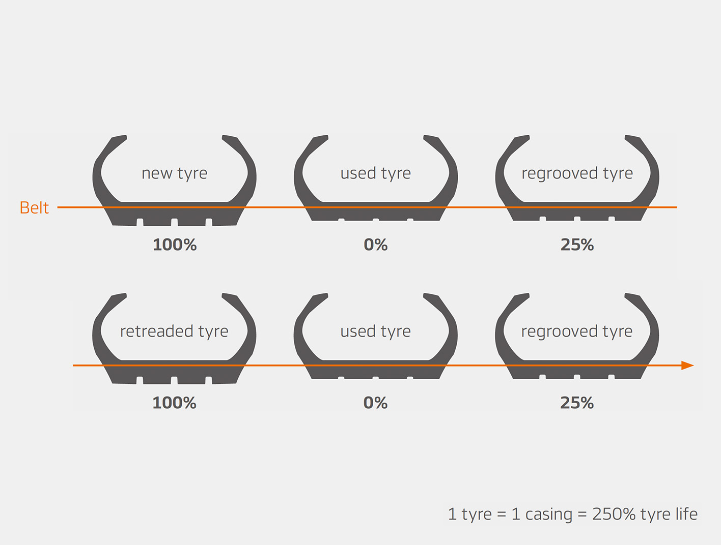 Hankook premium tyres are manufactured with robust carcass design and additional regroove tread rubber to deliver a second regrooved tyre life and a third retread life.