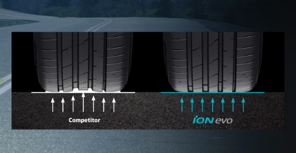 Battery weight makes electric vehicles up to 30% heavier than ICE vehicles, which frequently causes uneven wear on tyres. The iON evo is made of a compound specifically made for electric vehicles to evenly spread road pressure and extend tyre life in a healthier condition.